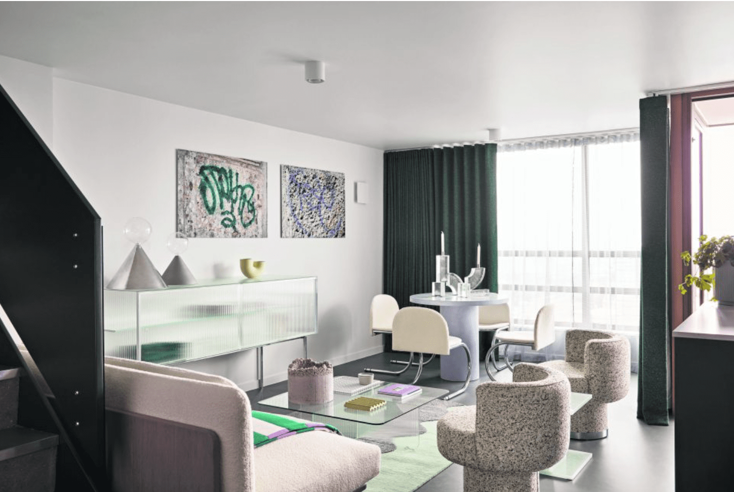 The 2LG apartment also borrows heavily from the Brutalist exterior of the Balfron, incorporating concrete, aluminium and jesmonite but softening this with lilac and mint accents. They created chairs in a speckled, stone-coloured fabric that looks like concrete, as well as a series of photographs, a wallpaper and soft furnishings inspired by the Balfron exterior, which are available to buy.