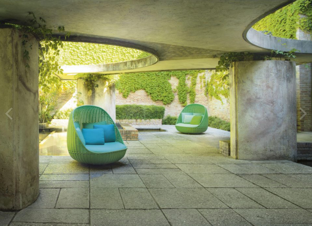 Pierre Frey’s lustrous, paisley-patterned fabric in shades of deep pink and green would bring a touch of retro-inspired decadence to any lockdown lounge, while Italian designer Paola Lenti’s outdoor chairs use a combination of natural and industral materials to create bold, woven textures, and are also recyclable.